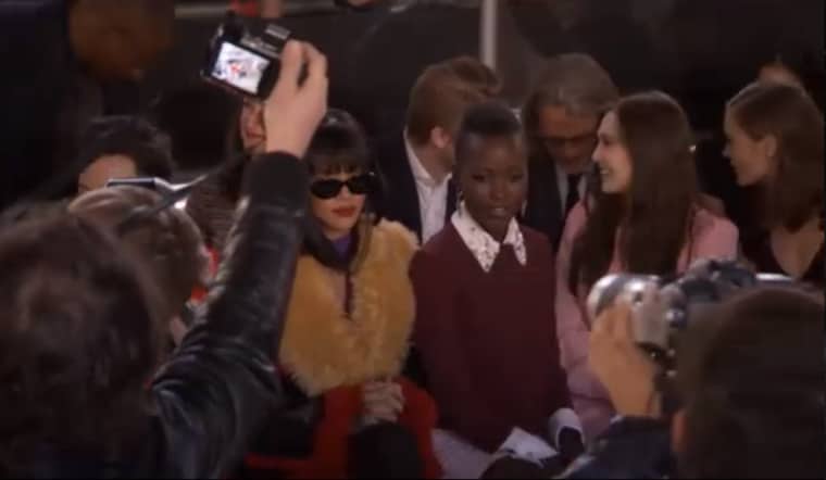 Our two favorite fashion icons of the moment, Rihanna Fenty and Lupita Nyong'o, were scrunched together at the front row of Miu Miu (Nyong'o is currently the face of the brand) this morning in Paris, and oh to be a fly on the wall and eavesdrop into that conversation. They certainly both have a lot to talk about: Nyong'o just won the Oscar for Best Supporting Actress, Rihanna's been stunting all over Paris. But since there was a runway show going on front of them (picture below), we bet they were picking out outfits; they should have little fear about overlap: we see Lupita gravitating towards the more ladylike shift dresses, and RiRi rocking those translucent rain jackets. All that matters is that they found time to take a selfie.