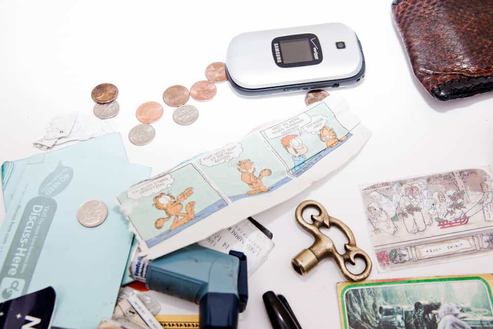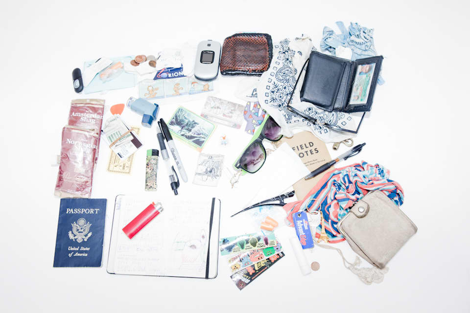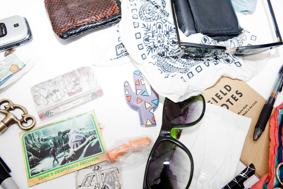 Yesterday, Vermont freak-folk collective Happy Jawbone Family Band performed at The FADER FORT Presented by Converse in Austin. Even though they had three more shows to play later that day, the Gen F alums took a few minutes after their set to empty their pockets and fanny packs, revealing gems like a German-language Garfield comic, a vintage Star Wars trading card, a flip phone, a small ceramic cactus, and lots of rolling tobacco. All together, the haul is as colorful and out-there as their sound.