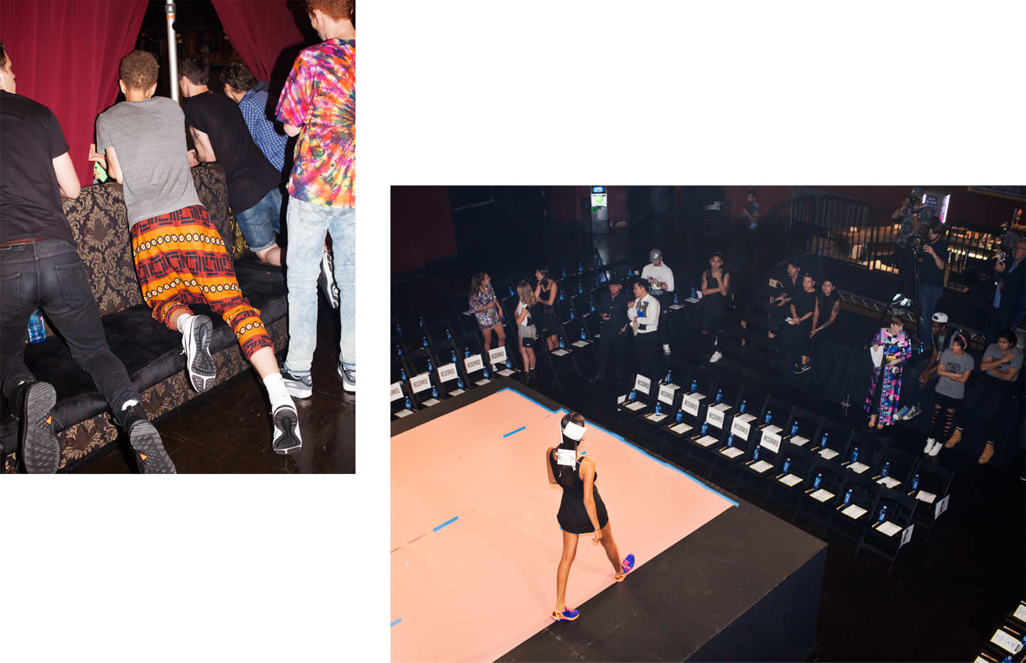 Last night, VFiles hosted their third-ever VFiles Made Fashion runway show. Sticking to their ethos of being a crowd-sourced, open-access entree to the ever imposing fashion world, the Downtown NYC shop and multi-media movement erected a massive runway in the middle of Webster Hall to present some Tumblr-discovered designers—D.TT.K, HAMM, ZDDZ and Tigran Avetisyan—to the masses. Photographer Sam Clarke ventured backstage to capture the prep before the PLUR-friendly pomp and circumstance of the show and lingered way past the finale to watch VFiles crown the first ever VFiles x Def Jam DJ Champion: Gianni Lee.