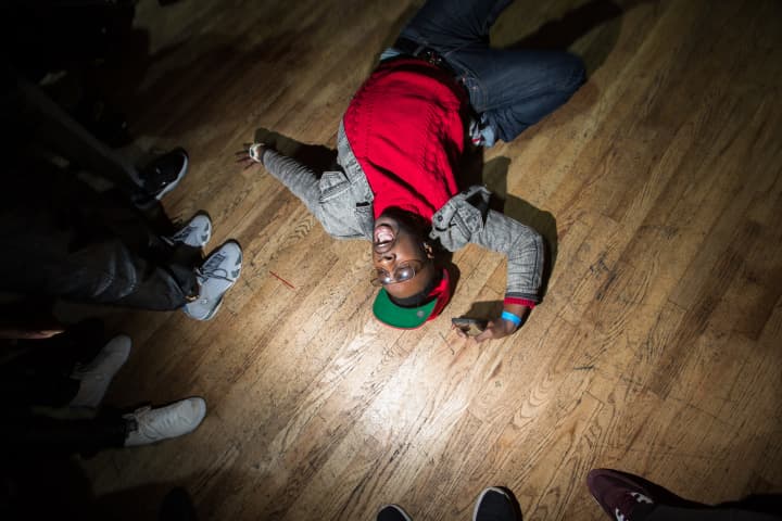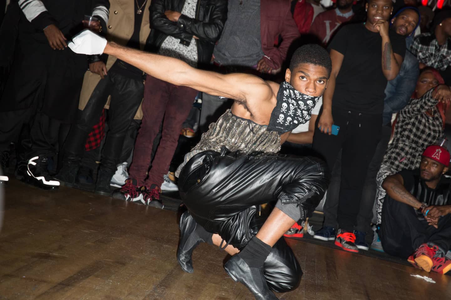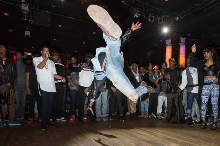 A dancer showcases his moves during the ball, before the competition categories begin, with commentator Qween Beats Symba McQueen on the mic behind him.