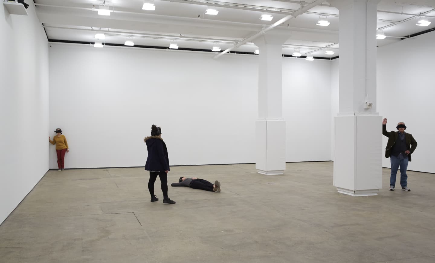 For the most part, I wandered around slowly with my arms outstretched—aware that at any moment I'd be making a collision with something or someone, wondering if I'd still feel surprised when I did. As it turned out, bumping into walls was actually more comforting than jolting, grounding me within the predictable, rectangular geometry of an art gallery on 36th street, enabling me to suss out its size by walking the length of one side, then another. Bumping into people wasn't. I didn't like getting my hand stepped on when I sat down on the floor at one point, hoping for some reason to meditate (how could I?). And I especially didn't enjoy the two or three times when I was the one inadvertently crashing into or stepping on others. More than being on the receiving end of an unwanted touch, the prospect of touching someone else without his or her permission was the part of the show that rattled me the most. Each time it happened—and it did, several times—it set off all my shame and embarrassment buttons, making me wonder why I felt so weird about a happening that was simply the result of having a body and taking up space in a room.