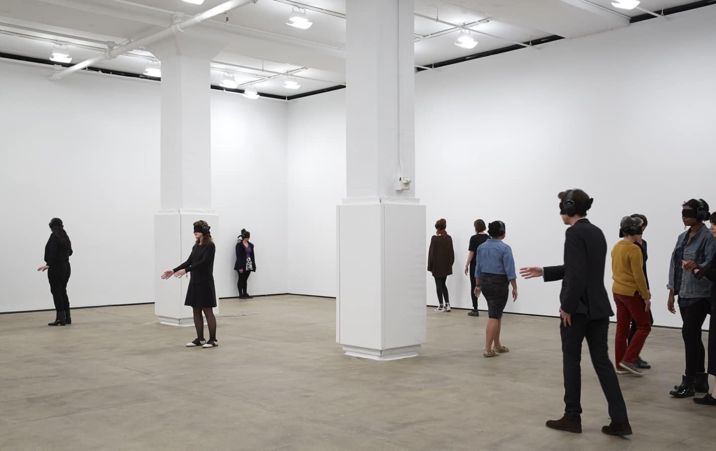 Full disclosure: I have some issues with spatial orientation. I once fainted in front of a date at the Hayden Planetarium, but despite that, upon arriving at Sean Kelly Gallery last week, I wasn't terribly anxious about having my sight and sound taken away for the sake of art. Emilie, Patrick, Steven and I had cabbed it over there together but wouldn't be leaving together, agreeing to take as much time in the space as we liked. I placed my iPhone in a locker, and walked toward a young women dressed in all black. She told me the rules: walk slowly; try not to make any noise; sit, stand, or lay down as you'd like, and raise your hand when you're ready to leave. Her tone was measured and gentle, like a mother saying “there, there." Then she placed a black blindfold and noise-cancelling earphones atop my head.